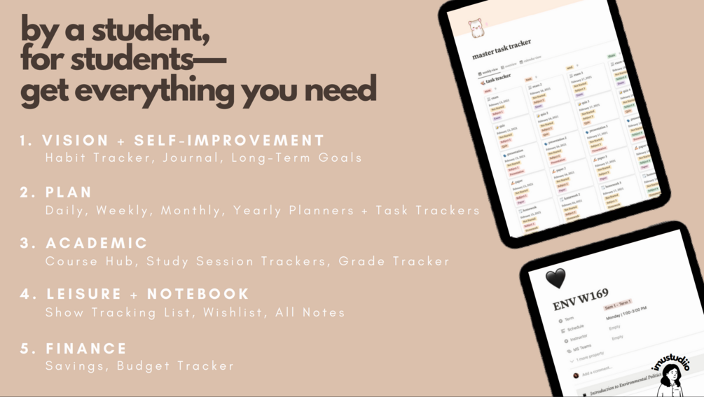 i got you. as a college student myself, i often found it difficult to keep track of all of the deadlines for assignments, club meetings, and my own habits and self-improvement goals. that was, until i put this template together which is an all-in-one of everything you could need. my template has worked for countless of friends and i'm so excited for it to work 4 you too!! plus, its super pretty to look at :)